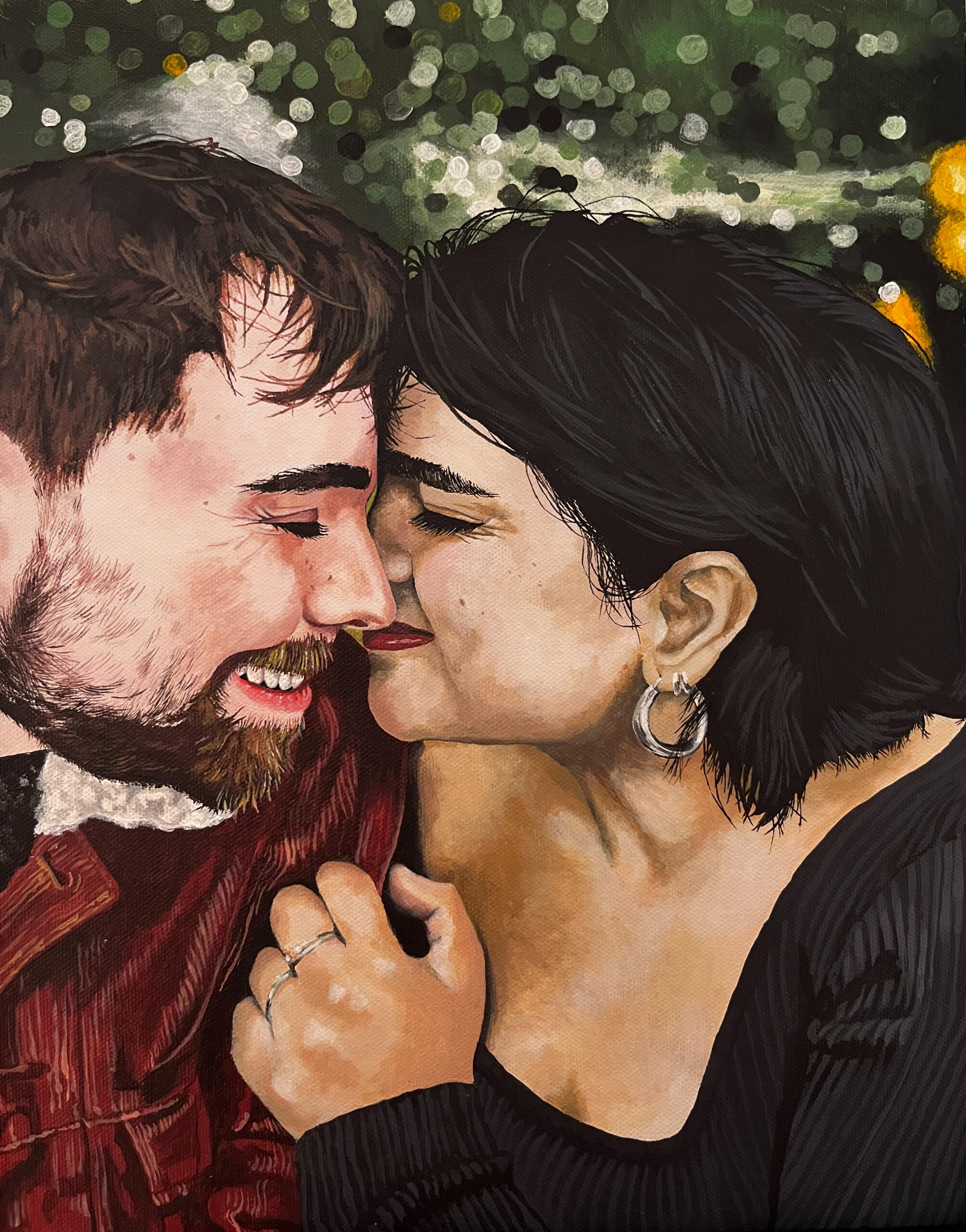 Newlyweds captures the quiet intensity of love between two people newly joined in marriage. Their embrace is soft, the wife's ring glinting as a delicate symbol of devotion. Every brushstroke is intentional capturing the significance of their bond, compassion, unconditional support, and tenderness. This painting took three months to complete, and is my most detailed piece ever.